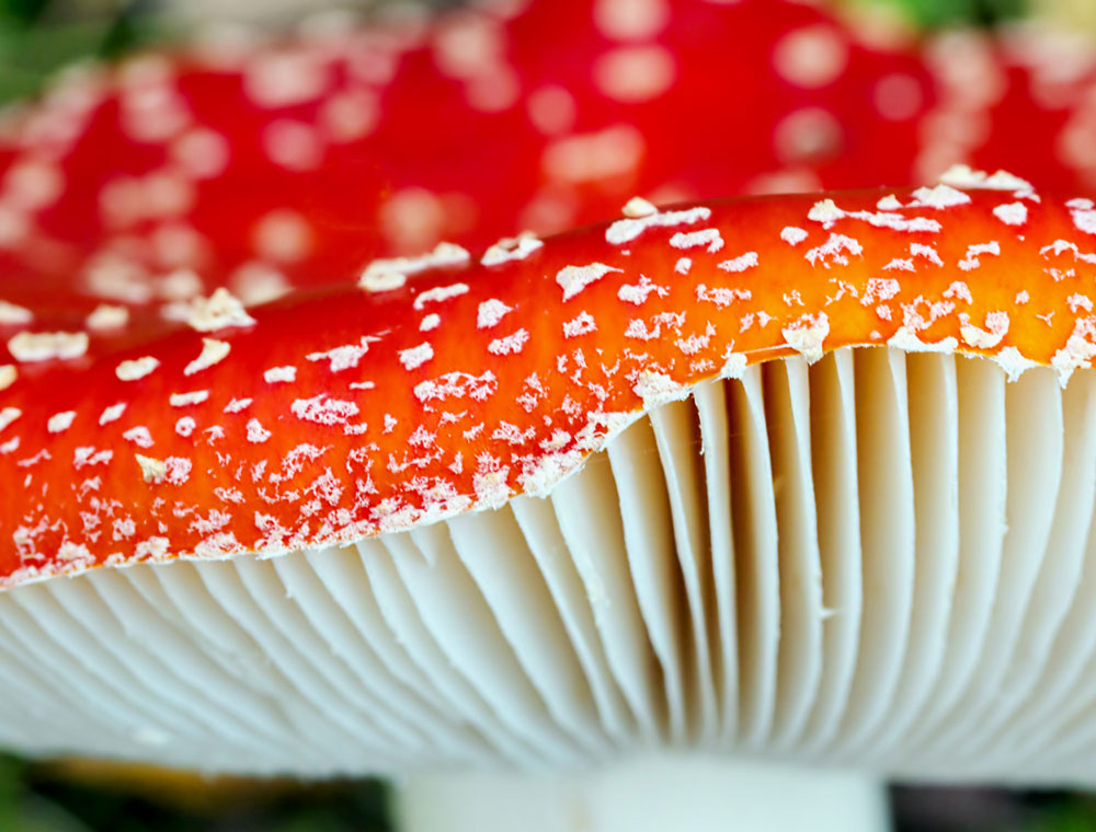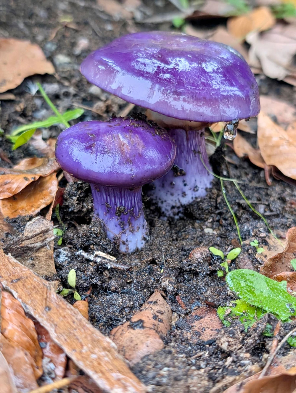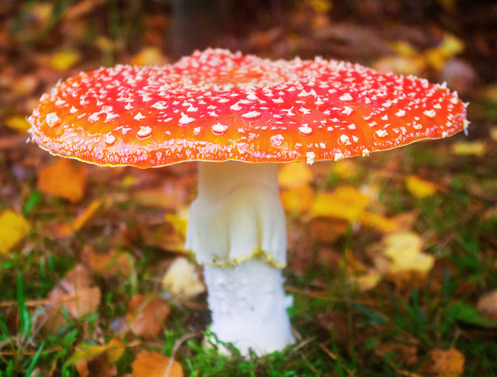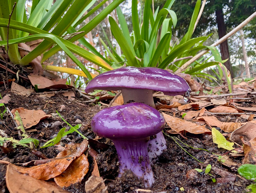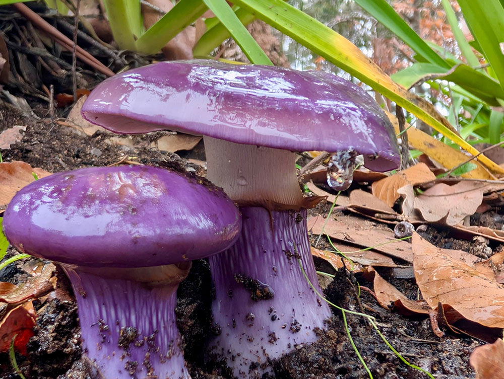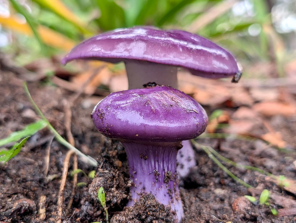A striking purple mushroom known as the Amethyst Deceiver, vibrant, velvety, and rare in most parts of WA. A bright orange flat capped toadstool, speckled with white dots.