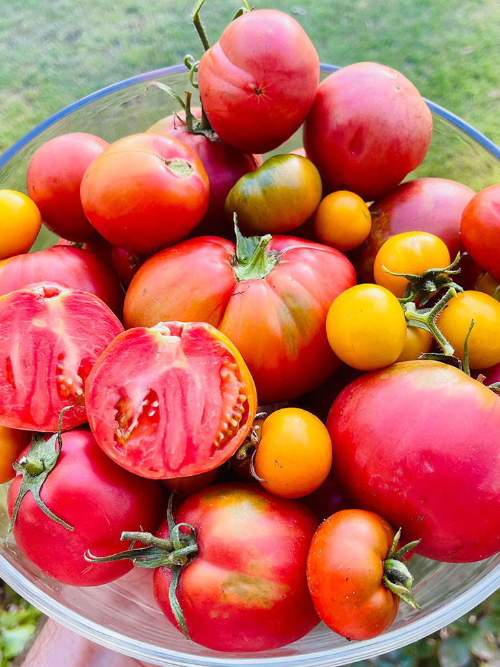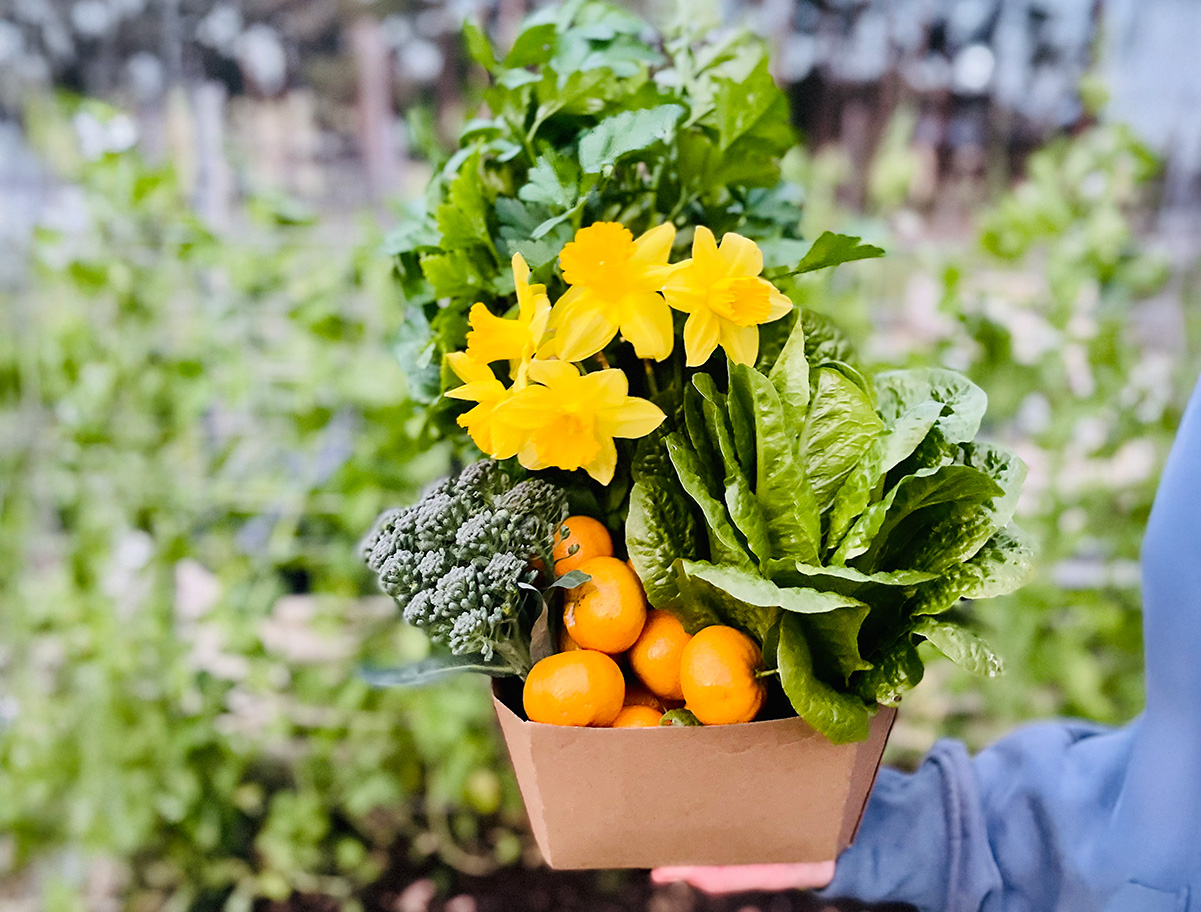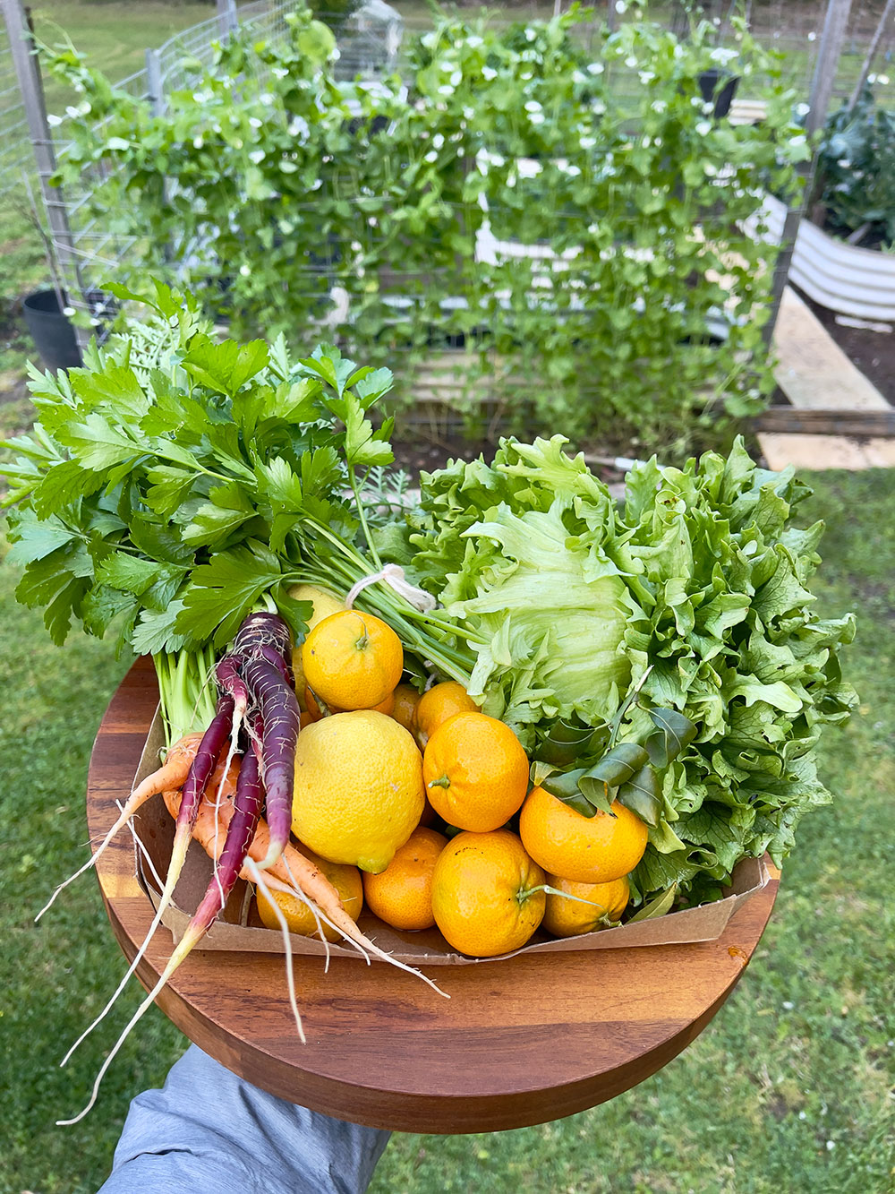 Citrus trees bursting with oranges, lemons and limes. Rows of lettuce, tomatoes, pumpkin, and more from our veggie gardens plus delicious feijoas, juicy figs, and other fruits.